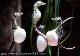 Il s'embellit aussi de couleurs vives. Lorsque les couples sont formés, les partenaires enlacés remontent en surface et la femelle transfère près de 300 oeufs dans la poche ventrale du mâle qui les incubera près de 4 semaines (1 mois).